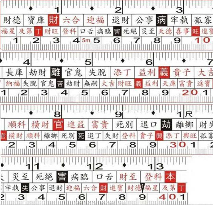 鲁班尺通称「文公尺」长一尺四寸一分,以生老病死苦五字为基础,划分为八格,各有凶吉,依序为:财(钱财、才能)、病(商灾病患、不利)、离(六亲离散分离)、义(符合正义及道德规范,或有劝募行善)、官(官运)、劫(遭抢夺、胁迫)、害(罹患)、本(事物的本位或本体)。