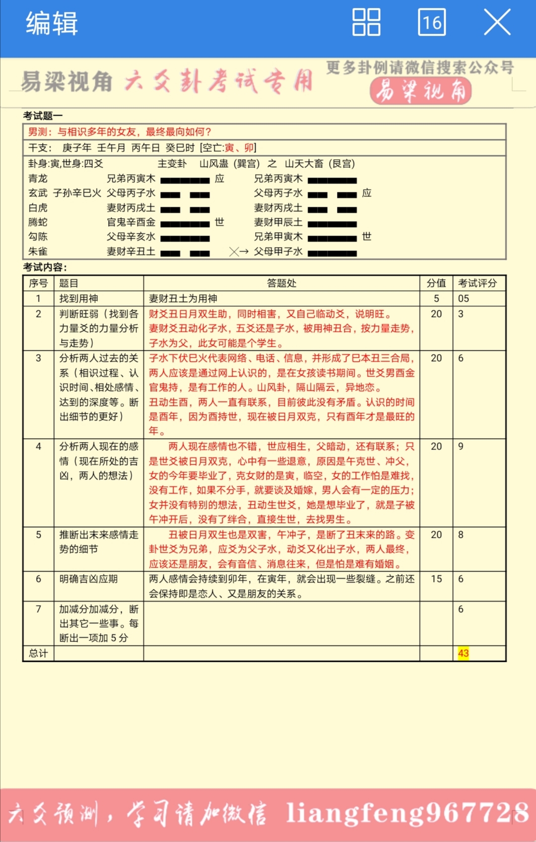3 | 分析两人过去的关系(相识过程、认识时间、相处感情、达到的深度等。断出细节的更好) | 子水下伏巳火代表网络、电话、信息,并形成了巳本丑三合局,两人应该是通过网上认识的,是在女孩读书期间。世爻男酉金官鬼持,是有工作的人。山风卦,隔山隔云,异地恋。 丑动生酉,两人一直有联系,目前彼此没有矛盾。认识的时间是酉年,因为酉持世,现在被日月双克,只有酉年才是最旺的年。 | 20 | 20 |